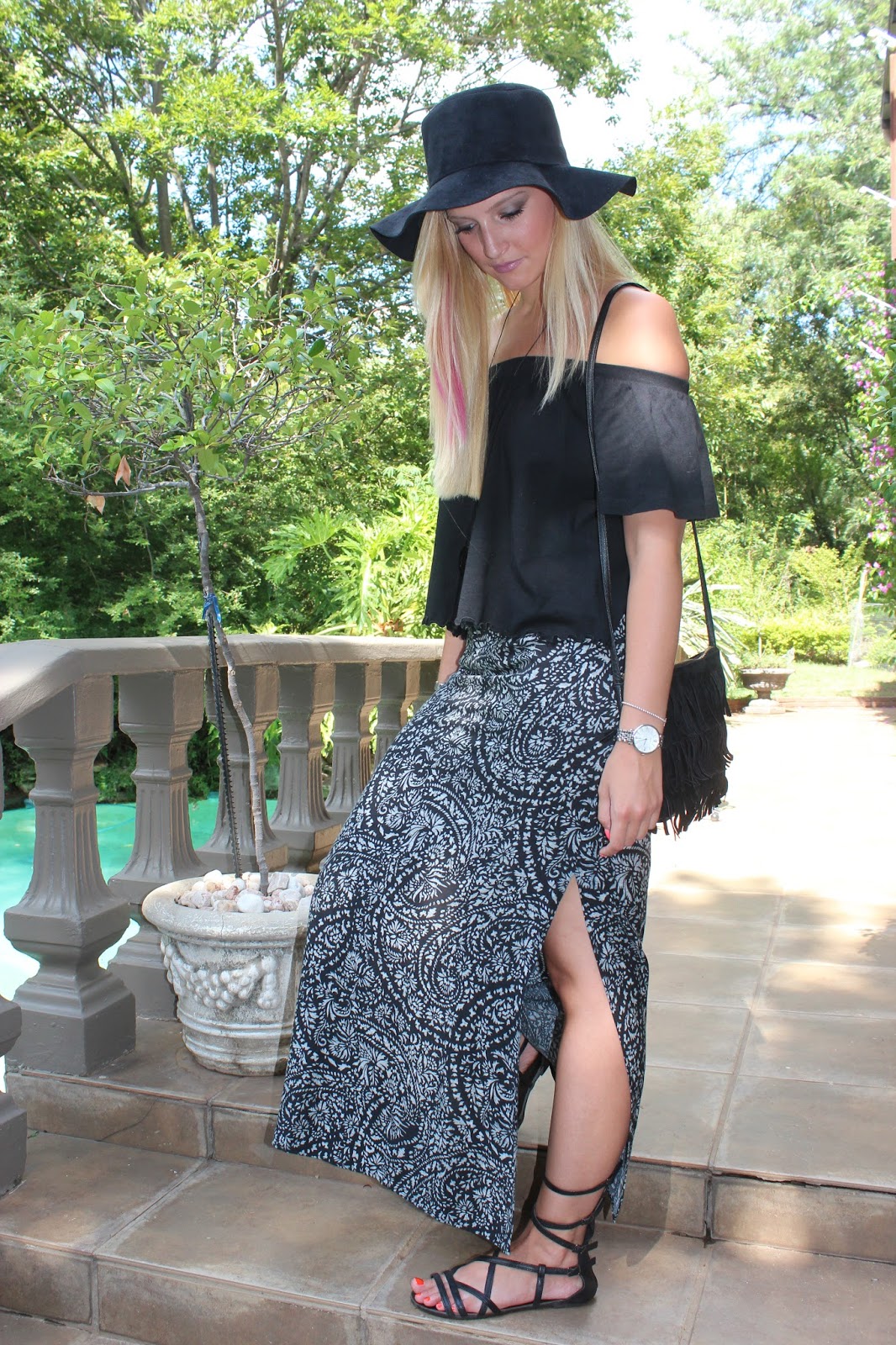 I love the off-the-shoulder black top. It is an incredible combination with the maxi skirt (as shown above), but can also look fabulous when paired with a pair of jeans.